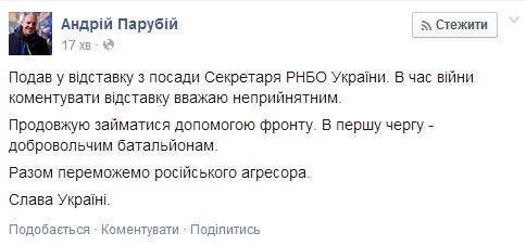 Секретар Ради національної безпеки та оборони Андрій Парубій написав заяву про відставку. Про це він повідомив на своїй сторінці у Facebook у четвер, 7 серпня.