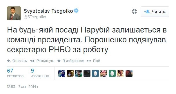 У свою чергу, прес-секретар президента України Петра Порошенка Святослав Цеголко написав на своїй сторінці у Twitter про те, що президент подякував секретарю РНБО за роботу і пообіцяв, що на будь-якій посаді Парубій залишиться в його команді.