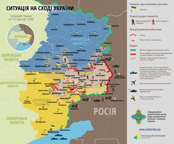 Рада національної безпеки та оборони оприлюднила карту АТО на Донбасі станом на вівторок, 12 серпня.