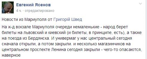 "На ЗД вокзалі Маріуполя черги немаленькі - народ бере квитки на львівський та київський (і квитки, в принципі, є), а також на поїзди з Бердянська. Універмаг у нас центральний сьогодні відкрили спочатку, а потім закрили. І кілька магазинчиків на центральному проспекті Леніна сьогодні закрили - чогось побоюються, напевно", - повідомив мешканець Маріуполя Григорій на своїй сторінці в Facebook.