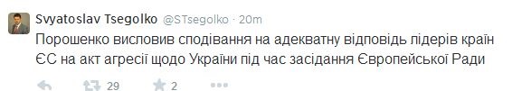 Президент України Петро Порошенко сподівається на адекватну відповідь лідерів країн Європейського Союзу на акт агресії проти України. Про це президент заявив у ході зустрічі з керівництвом ЄС в суботу у Брюсселі, повідомив у Твіттері його прес-секретар Святослав Цеголко.
