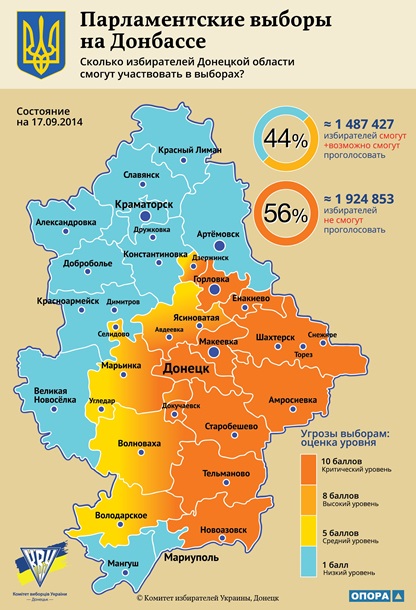 За даними Донецької обласної організації Комітету виборців України, не менше 54% виборців Донецької області не зможуть взяти участь у голосуванні на позачергових парламентських виборах, які відбудуться 26 жовтня.