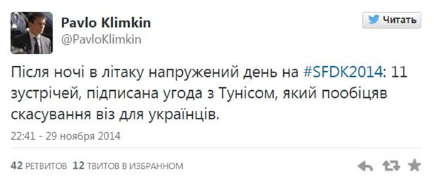 "Після ночі в літаку напружений день. 11 зустрічей. Підписано угоду з Тунісом, який пообіцяв скасування віз для українців", - написав міністр.
