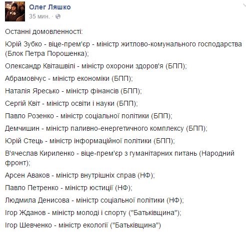 Лідер Радикальної партії Олег Ляшко оприлюднив на сторінці у Facebook попередній склад Кабінету Міністрів, запропонований коаліцією.