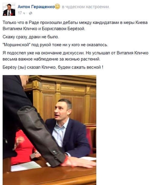 Нардеп Антон Геращенко у своєму Facebook написав, що вспів до завершення зустрічі Кличка і Берези. За його словами, Віталій Кличко пообіцяв навесні посадити березу. Примітно, що на недавньому суботнику, висаджуючи дерева, Кличко відмовився садити березу і волів клен.