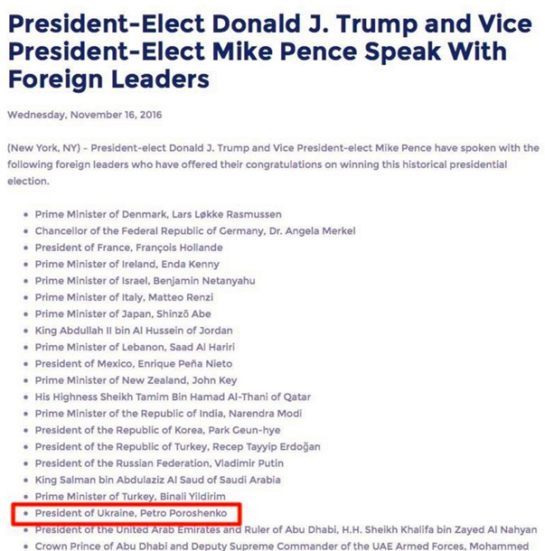 Команда Трампа опублікувала список з 29 лідерів держав, з якими після виборів поговорив новий президент США і обраний віце-президент Майк Пенс. Серед них, зокрема, президент України Петро Порошенко і президент РФ Володимир Путін.