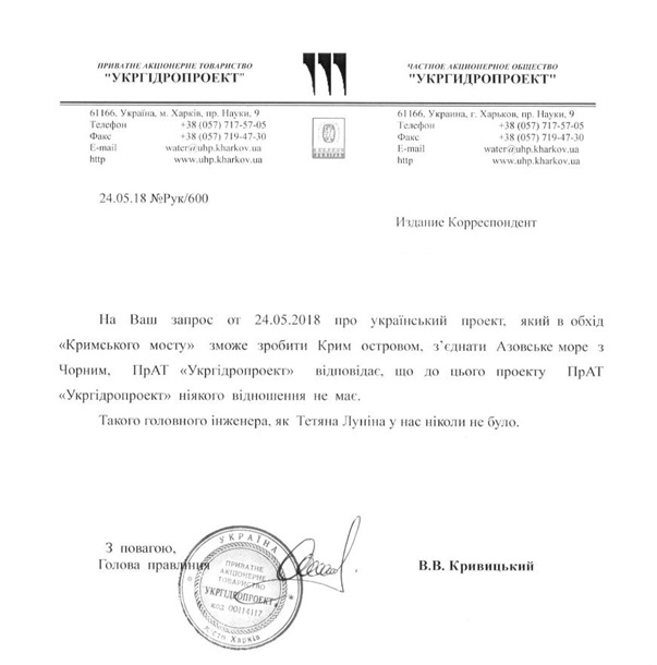 "По-перше, Тетяна Луніна ніколи протягом 70 років не працювала в Укргідропроекті. По-друге, ми до цього об'єкту не маємо жодного відношення і про цю т.зв. новину дізналися тільки від вас. Крім того, наше підприємство взагалі не займається проектуванням каналів. Воно займається гідроелектростанціями", - сказав Осадчий.