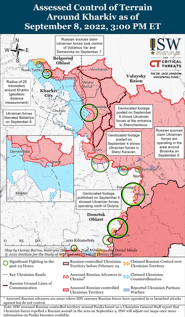 6 вересня ЗСУ провели в районі Балаклії контратаку, яка, ймовірно, відкинула російські сили на лівий берег (північний бік) рік Сіверський Донець та Середня Балаклійка, повідомляв Інститут вивчення війни.