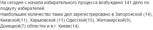 За час виборчої кампанії з позачергових парламентських виборів 2014 порушено 141 справу за фактом підкупу виборців. Про це на своїй сторінці в Facebook повідомив міністр внутрішніх справ України Арсен Аваков в суботу, 18 жовтня.