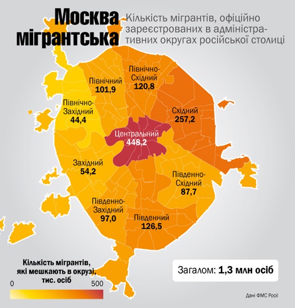 За даними російської Федеральної міграційної служби, у 12-мільйонній столиці РФ проживають більше 1,3 млн нелегалів. Однак цю цифру експерти вважають заниженою, оскільки вона враховує лише тих приїжджих, які стали на облік