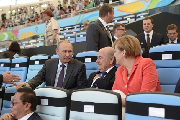 Путін і Меркель мило розмовляють на футболі в Німеччині (між ними - президент ФІФА Зепп Блаттер)