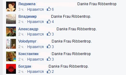 Українці навіть влаштували флешмоб-протест у Facebook-акаунті німецького канцлера, порівнявши її з радником Адольфа Гітлера щодо зовнішньої політики Йоахімом фон Ріббентропом, що підписав із Радянським Союзом угоду щодо розділення сфер впливу в Європі у 1939 році.