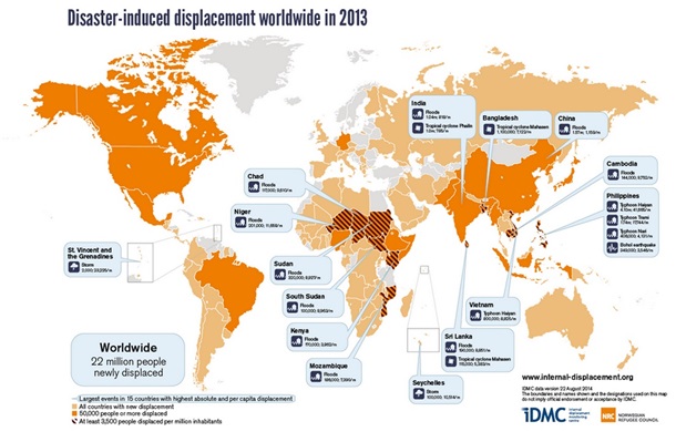 У 2013 році близько 22 млн осіб в усьому світі були змушені залишити свої домівки внаслідок стихійних лих, що у три рази перевищує кількість людей, що рятуються від збройних конфліктів. Про це повідомляє Центр новин Організації об'єднаних націй (ООН).
