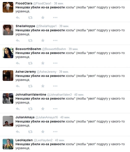 Як приклад наведено набір акаунтів, які 27 лютого через кілька годин після вбивства російського опозиціонера Бориса Нємцова розмістили в Twitter одну і ту ж фразу: "Нємцова вбили через ревнощі хохли (нібито забрав подругу у якогось українця)".