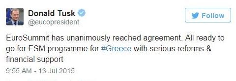 "Євросаміт одностайно досяг угоди. Всі готові піти на програму ESM для Греції із серйозними реформами та фінансовою підтримкою", - написав Туск.
