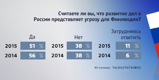 Станом на сьогоднішній день 51% фінів вважають східного сусіда загрозою для країни, тоді як рік тому такої думки дотримувалися 56% населення.