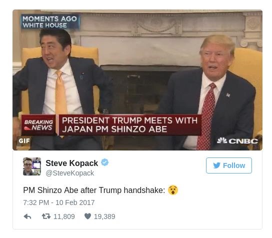 Після рукостискання Трамп зазначив, що в Абе сильні руки. Прем'єр посміявся і відвів погляд убік. Цей випадок пішов у соцмережі і став мемом.