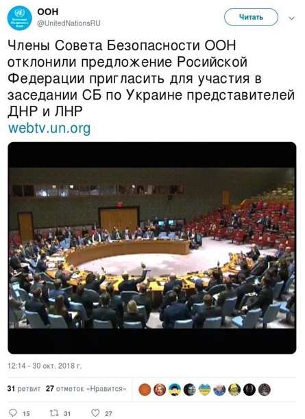 Члени Радбезу ООН відхилили пропозицію російської сторони запросити для участі в засіданні представників самопроголошених "республік", повідомляє служба новин ООН в Twitter.
