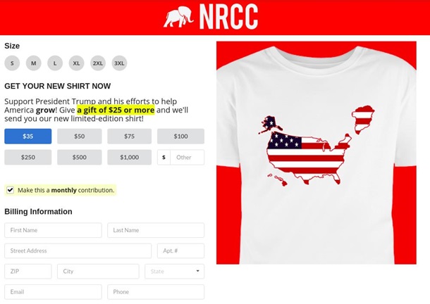 "Підтримай президента Трампа і його зусилля допомогти Америці зростати! Пожертвуй від 25 доларів і більше, і ми надішлемо тобі нашу нову футболку з обмеженої колекції", - йдеться в описі.