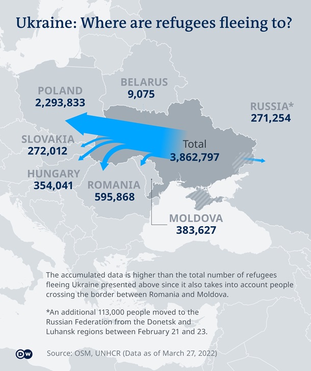 Заступник міністра внутрішніх справ Польщі Бартош Гродецкі запевнив, що у Євросоюзі приймуть усіх людей з України, які рятуються від війни. Він висловив очікування, що інші країни ЄС, подібно до Німеччини, активно пропонуватимуть біженцям переїхати на їхню територію.