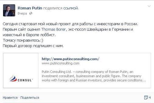 Племінник президента РФ Володимира Путіна Роман Путін запустив компанію Putin Consulting, повідомив він на своїй сторінці у Facebook.