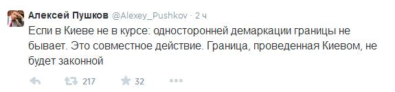"Якщо в Києві не в курсі: односторонньої демаркації кордону не буває. Це спільна дія. Кордон, проведений Києвом, не буде законним", - написав він.