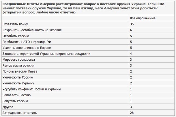 На переконання третини росіян (35%), головним мотивом здійснення поставок зброї в Україні для США може бути прагнення розв'язати воєнні дії. Рідше лунали припущення про те, що США не хочуть, щоб в Україні встановилася стабільність (6%), бажають послабити Росію (5%).
