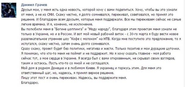 "Ось мій новий робочий виток - з 30-го березня я буду вести нове розважальне ранкове шоу "Кава з молоком" на НТВ. Коли мені надійшла ця пропозиція, то я злякався, скажу чесно, потім дуже довго сумнівався. Відразу скажу, проект буде без політики, негативу і жорсткості. Тільки позитив і мої дурні жарти. Я розумію, що хтось мене не зрозуміє і не підтримає. Але я хочу сказати головне - моя робота зараз тут, а моє серце в Україні. Я завжди був з вами відвертим, не приховував своїх поглядів, таким і залишаюся. Нехай хтось зі мною і не погоджувався", - написав телеведучий на своїй сторінці ВКонтакте.