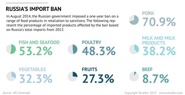 Росія ввела санкції щодо імпортних харчових продуктів 5 серпня 2014 року, у відповідь на санкції Заходу за агресію Москви в Україні. Навіть така міра разом з девальвацією рубля призвела до подорожчання продуктів харчування в середньому на 20% за останній рік. Ціна деяких основних товарів, таких як капуста, зросла більш ніж на 60% до початку 2015 року.