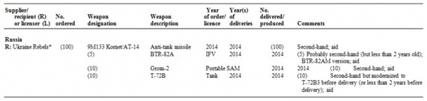 У звіті SIPRI з'явилася категорія "українські бойовики", які вказуються одержувачами зброї з Росії. У документі говориться, що Росія в 2014 році постачала їм протитанкові ракети, БТР, ПЗРК і танки.