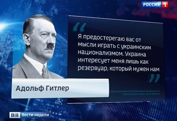 Журналіст Дмитро Кисельов у своїй програмі Вести недели процитував Адольфа Гітлера, розповідаючи про Україну. Відповідне відео опубліковано на каналі Вістей в YouTube.