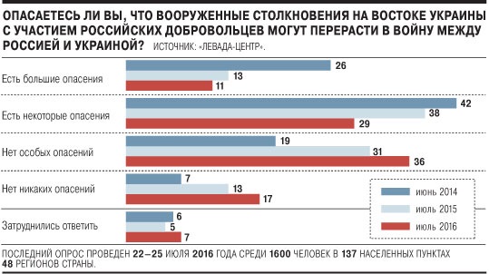 У 2014 році тільки 26 відсотків громадян Росії говорили, що у них "немає особливих побоювань", що збройний конфлікт на Донбасі "за участю російських добровольців може перерости у війну між Росією і Україною", в липні 2015 року - вже 44 відсотки. Тепер 61 відсоток опитаних росіян стверджує, що у них немає подібних страхів.