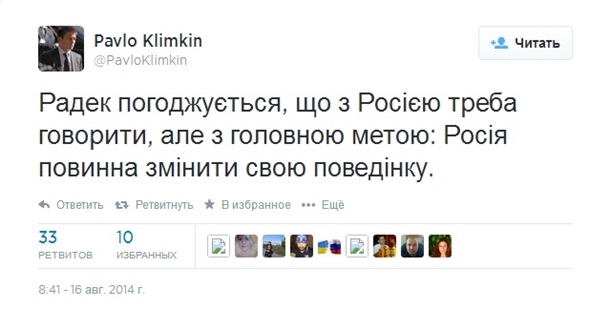 "Польща підтримує багатосторонні формати діалогу з РФ, як у Женеві або Нормандії. Очікуємо прогресу у Берліні", - прокоментував Клімкін свою розмову з міністром закордонних справ Радиславом Сікорським.